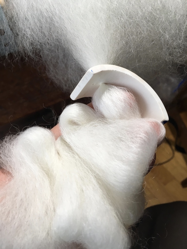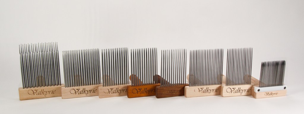 After using the EFs for a while, I realized that since I so strongly gravitate to very fine fibers, the EFs were only so effective on those fibers, so I bought the SuperFines. Then I was on a quest to buy the matching SF hackle. This was elusive. There was possibly only one made at the time. I requested, nagged really, and eventually I got my SF hackle. I now have my combing table set up perfectly to suit my combing needs. One side is for the SFs and one side for the EFs. I have not come across any 2.5″+ fiber that can’t be combed on one of them. Combed top is ooooh soooooo amazing!