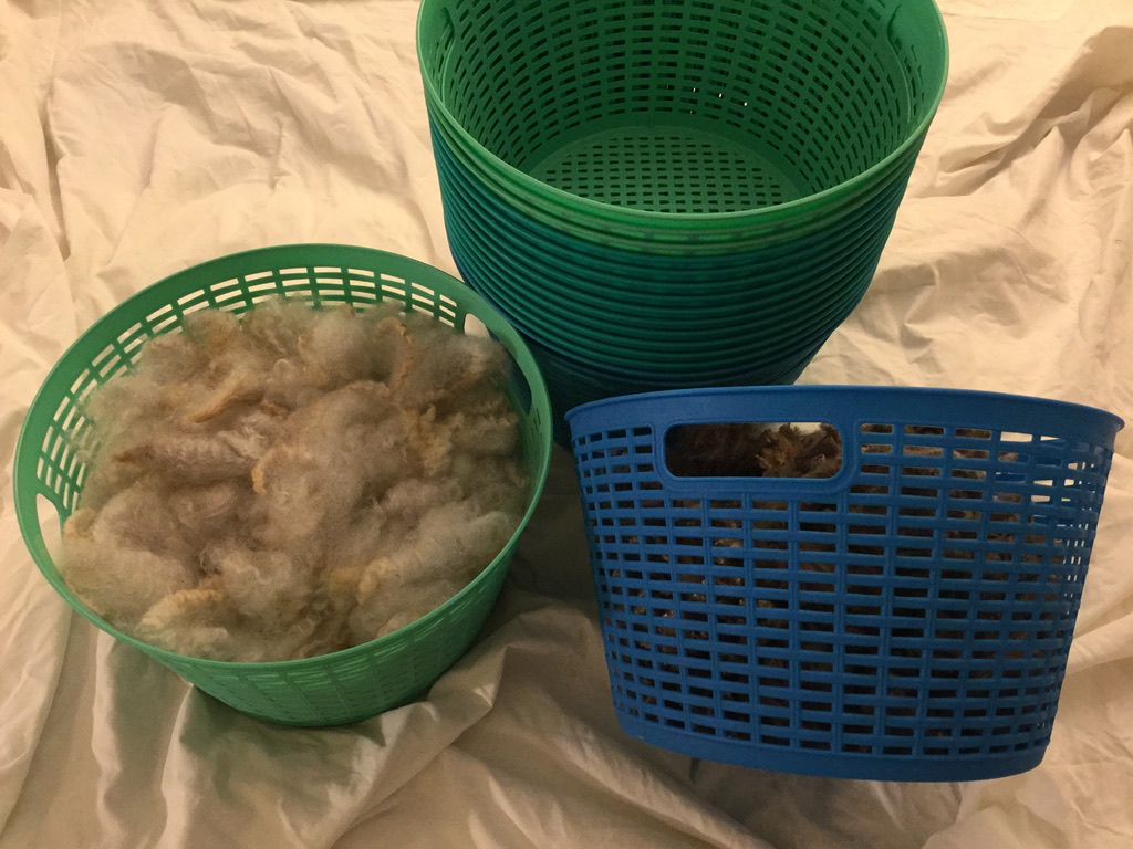 My favorite way to wash fleece is in these baskets. They fit perfectly in a 3.5 gallon bucket. The handle slots make them easy to lift out, they stack for efficient storage and as long as they’re not dropped, they should last for many, many years. I bought them from Dollar Tree (they aren’t currently available as far as I can find, as of 19 Feb 2024). I wash from 4–8 ounces in each, depending on the fiber. Someday I’d like to have a larger setup with one of those multi-basin sinks that you see in commercial kitchens…that would be sweet! Along with an on demand hot water heater! Oh, and an electric spin dryer! Eventually…